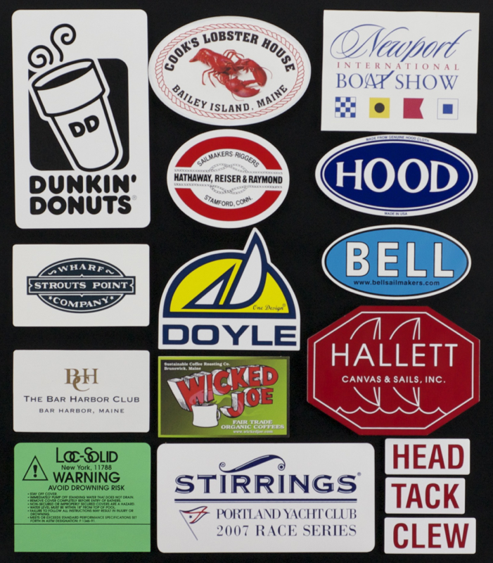 Screen printing on adhesive insignia cloth material. Logo and directional labels for sails, sailing accessories or garments.